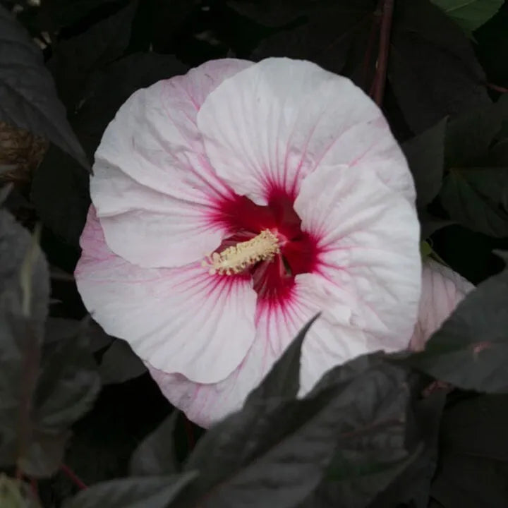 Hibiscus Summerific 'Perfect Storm'. Everything you want in a Hibiscus: awesome compact habit, huge flowers, and dark foliage. 7-8” wide, white flowers are edged with light pink, with a bright red eye that radiates out with the veins.